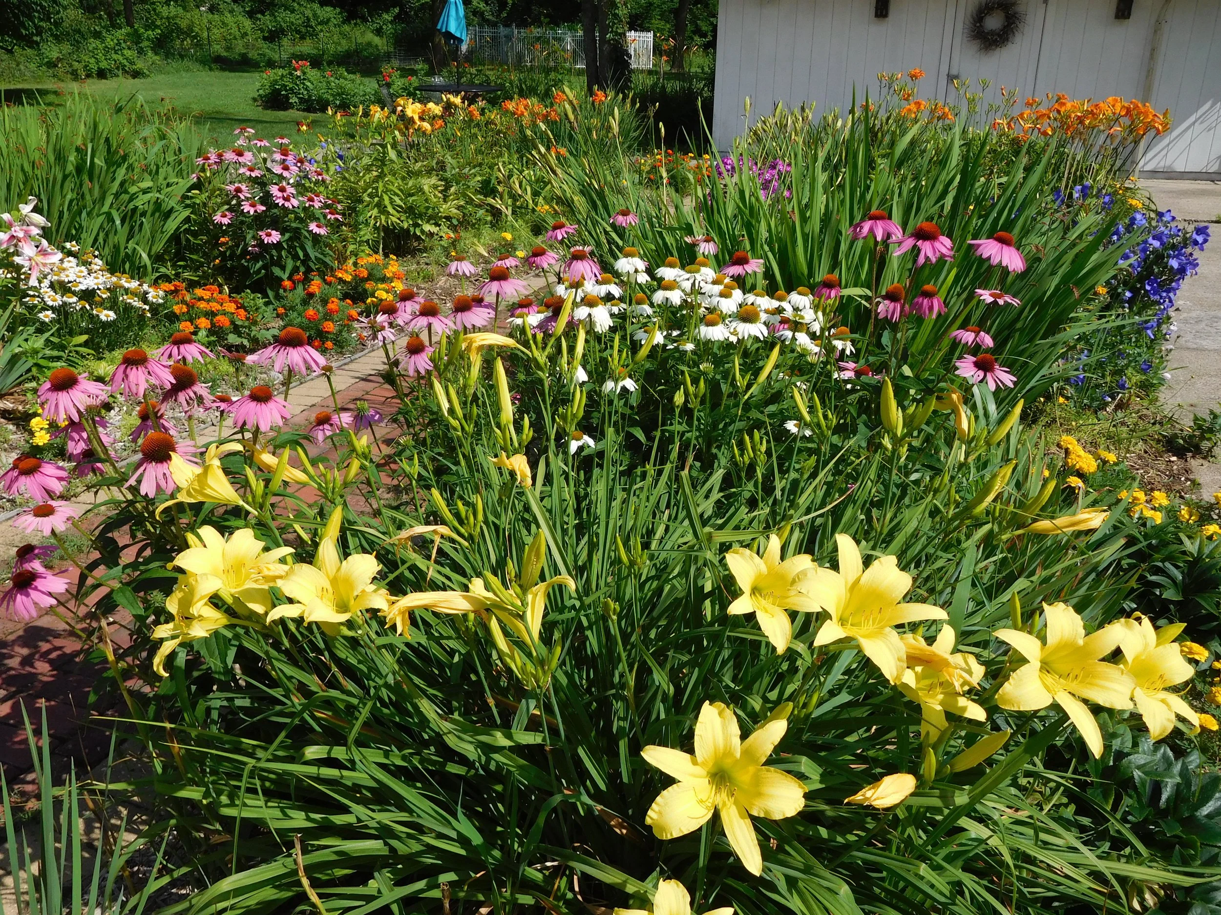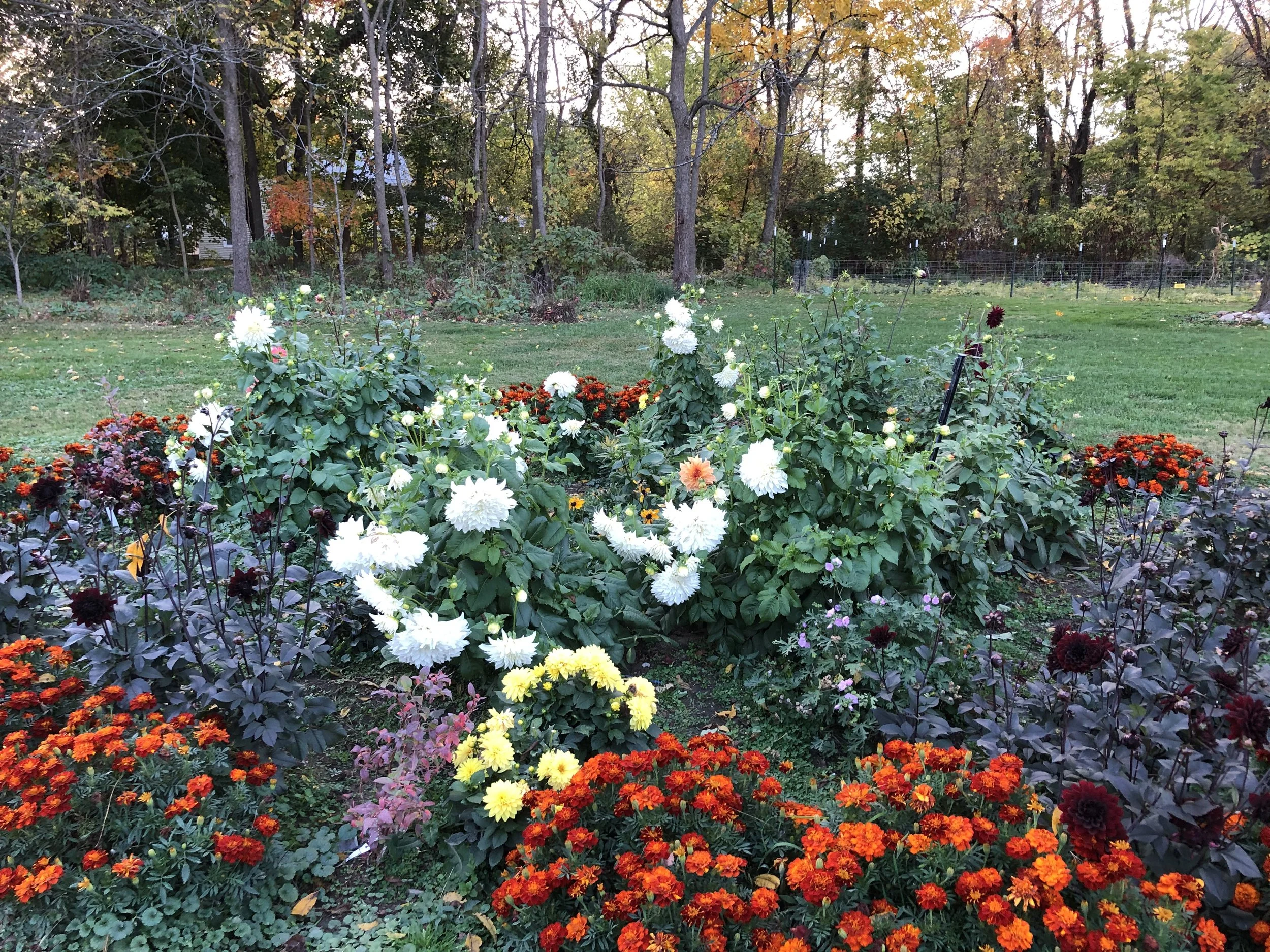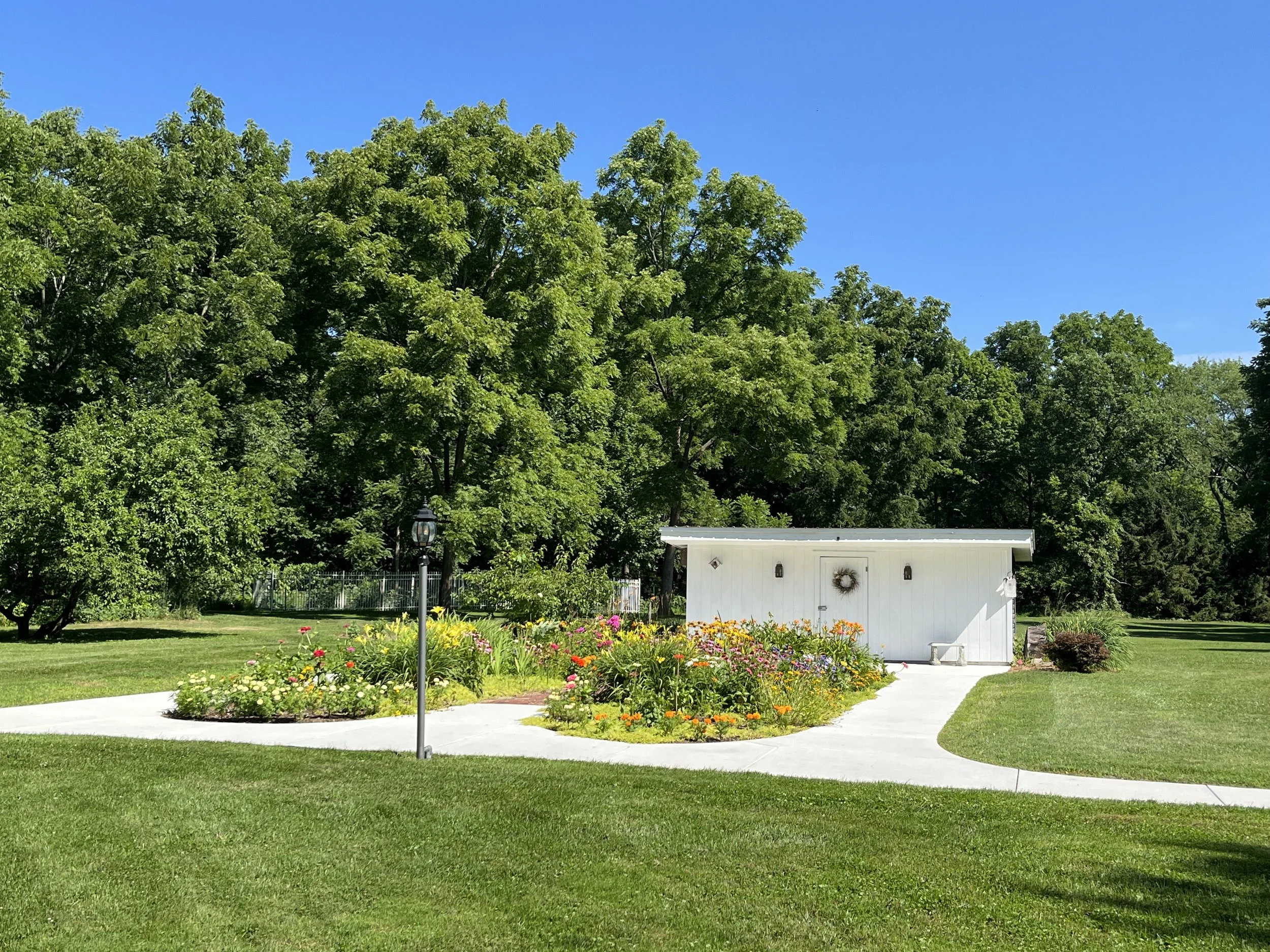 The expansive grounds include several colorful flower gardens as well as open lawns with wooded surroundings creating a picturesque outdoor space for ceremonies and entertaining guests.